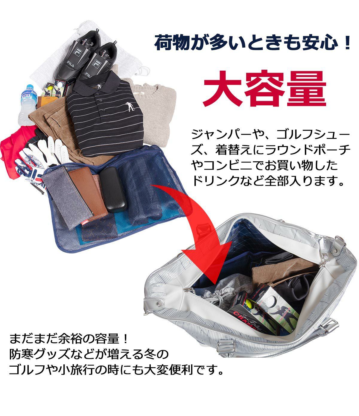 荷物が多いときも安心!大容量!ジャンパーや、ゴルフシューズ、着替えにラウンドポーチやコンビニでお買い物したドリンクなど全部入ります。