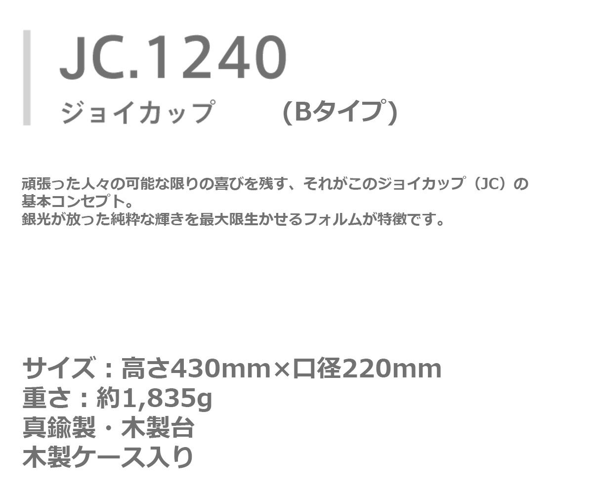 頑張った人々の可能な限りの喜びを残す、それがこのジョイカップ(JC)の基本コンセプト。銀光が放った純粋な輝きを最大限生かせるフォルムが特徴です。