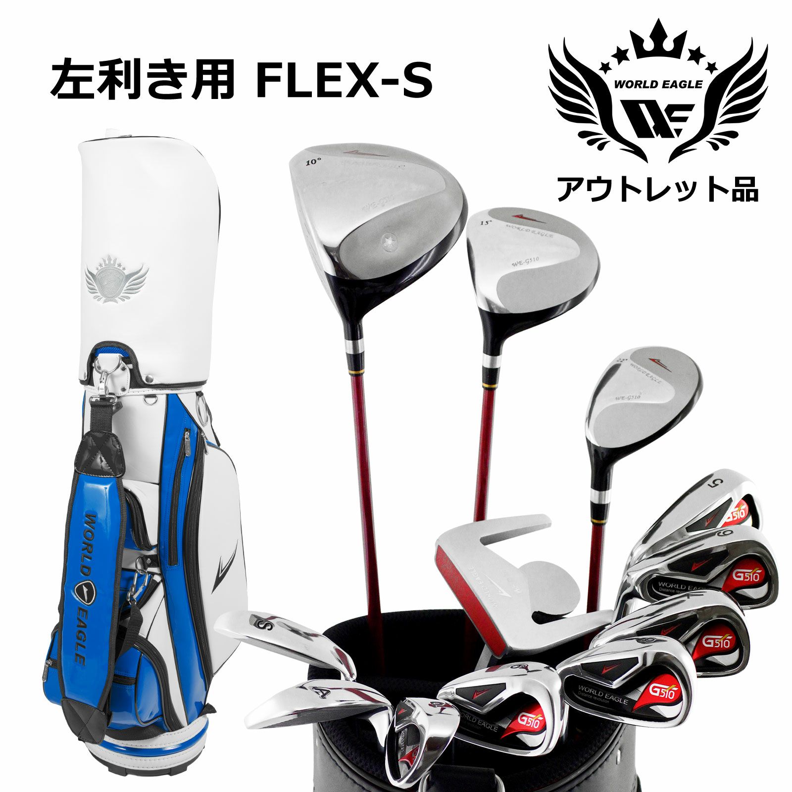 アウトレット品(わけあり 展示 撮影) WE G510 メンズゴルフクラブセット CBX005 ホワイト ブルー キャディーバッグ付き 左利き用 フレックスS 展示品