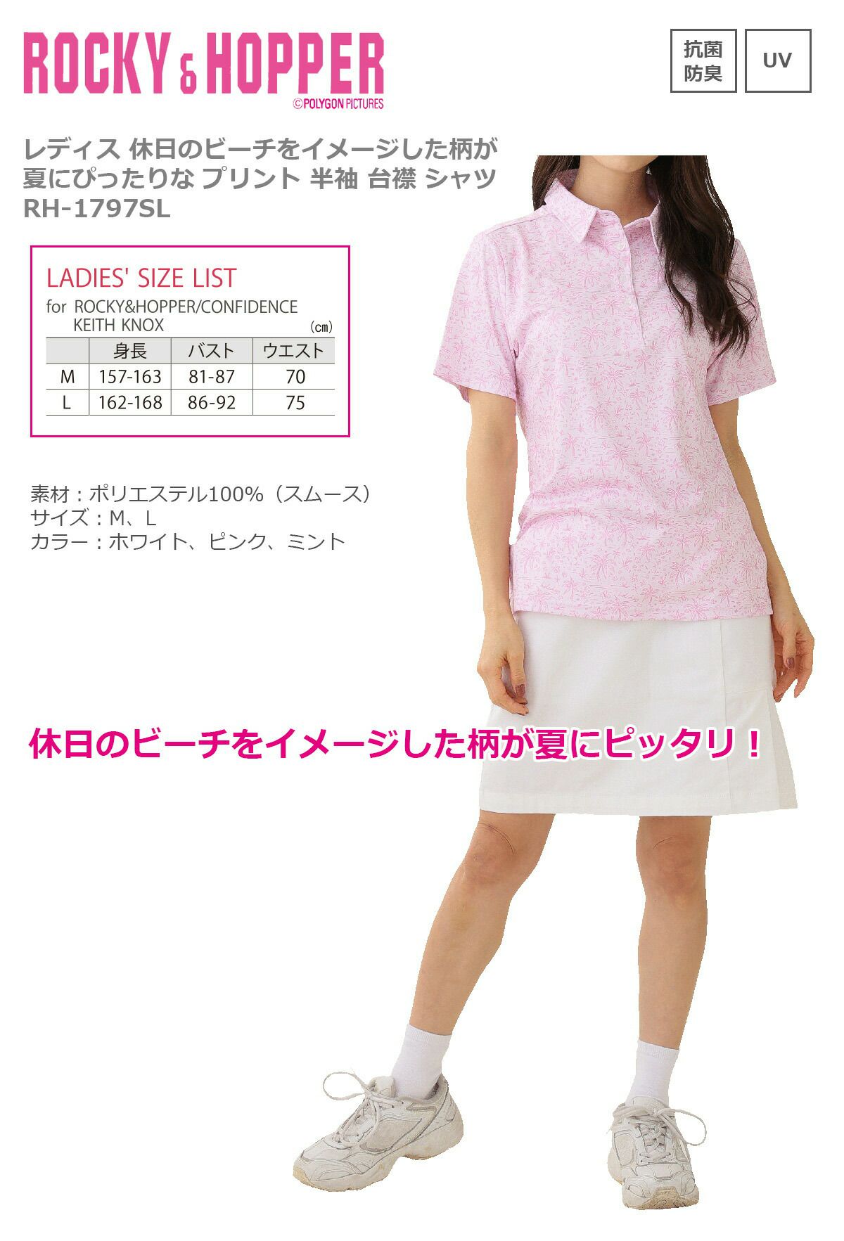ROCKY&HOPPER ロッキー&ホッパー レディス アクティブフレーズ プリント 総柄 半袖 ZIP ハイネックシャツ RH-1787SL