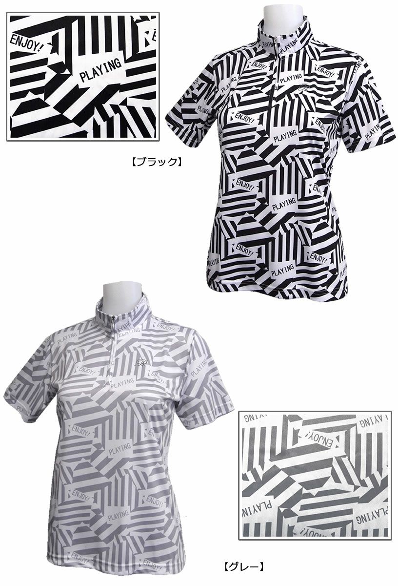 ロッキー&ホッパー ツートンカラーのコーション テーププリント柄半袖ZIPハイネックシャツ 【IR】
