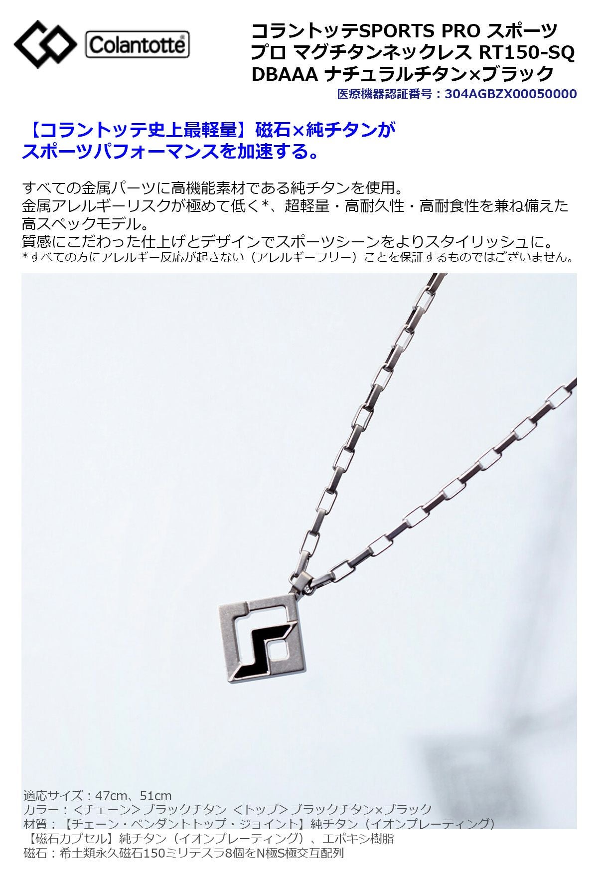 Colantotte コラントッテSPORTS PRO スポーツ プロ マグチタンネックレス RT150-SQ ナチュラルチタン×ブラック DBAAA