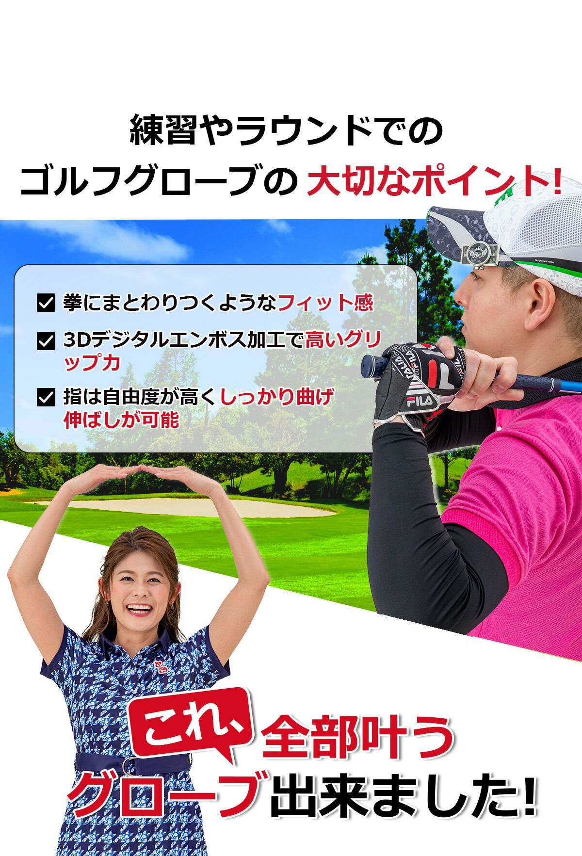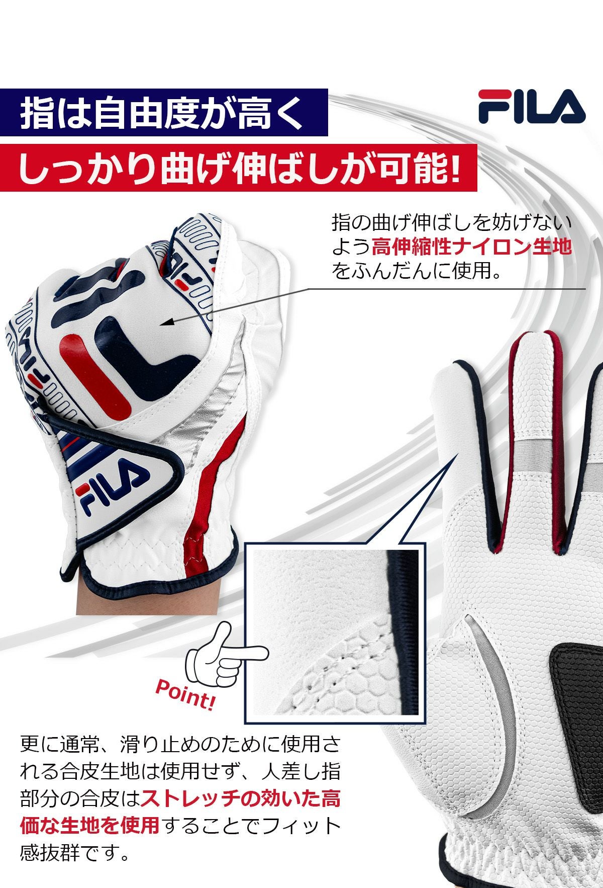 ゴルフ メンズ ワンサイズ グローブ フリーサイズ 右手 左手 夏 滑らない フィット感 人工皮革 全天候 グリップ力抜群 ストレッチ 手袋 通気性 ハイキング 自転車 ドライブ FILA ブランド 両手で揃う 男性 初心者 サイクリング テニス