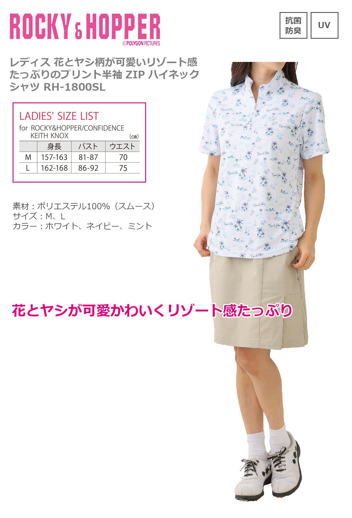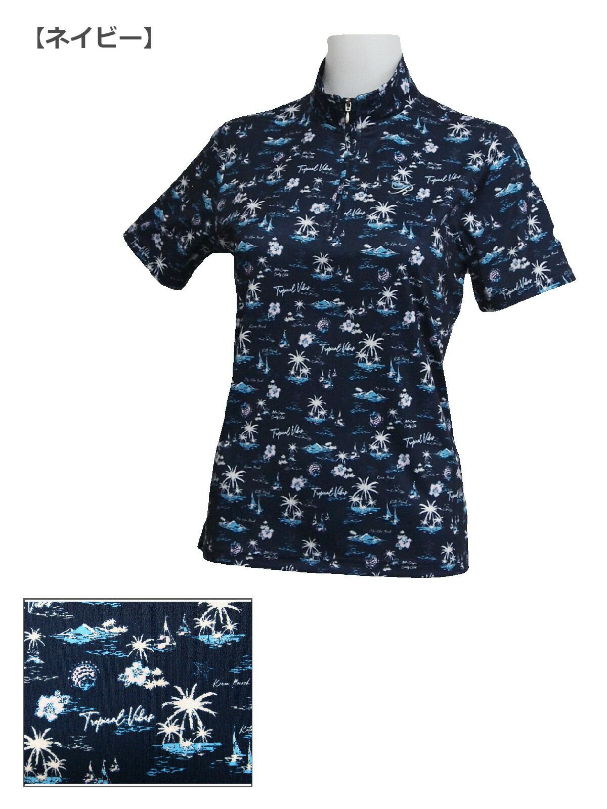 ロッキー&ホッパー レディス 花とヤシ柄が可愛い リゾート感たっぷり 半袖 ZIP ハイネック シャツ 【IR】